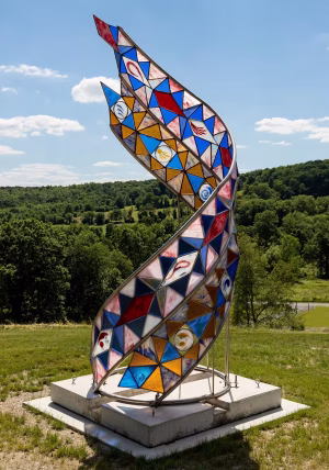The sculptures are unusual and varied. Most remarkable are the three large works of Stained Glass on Stainless Steel that are 12′ to 16′ high. The glass colors glow and change as the sun shines from different angles during the day and each season.